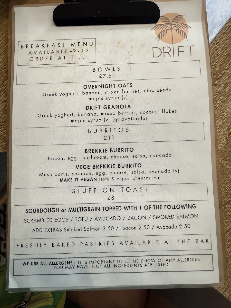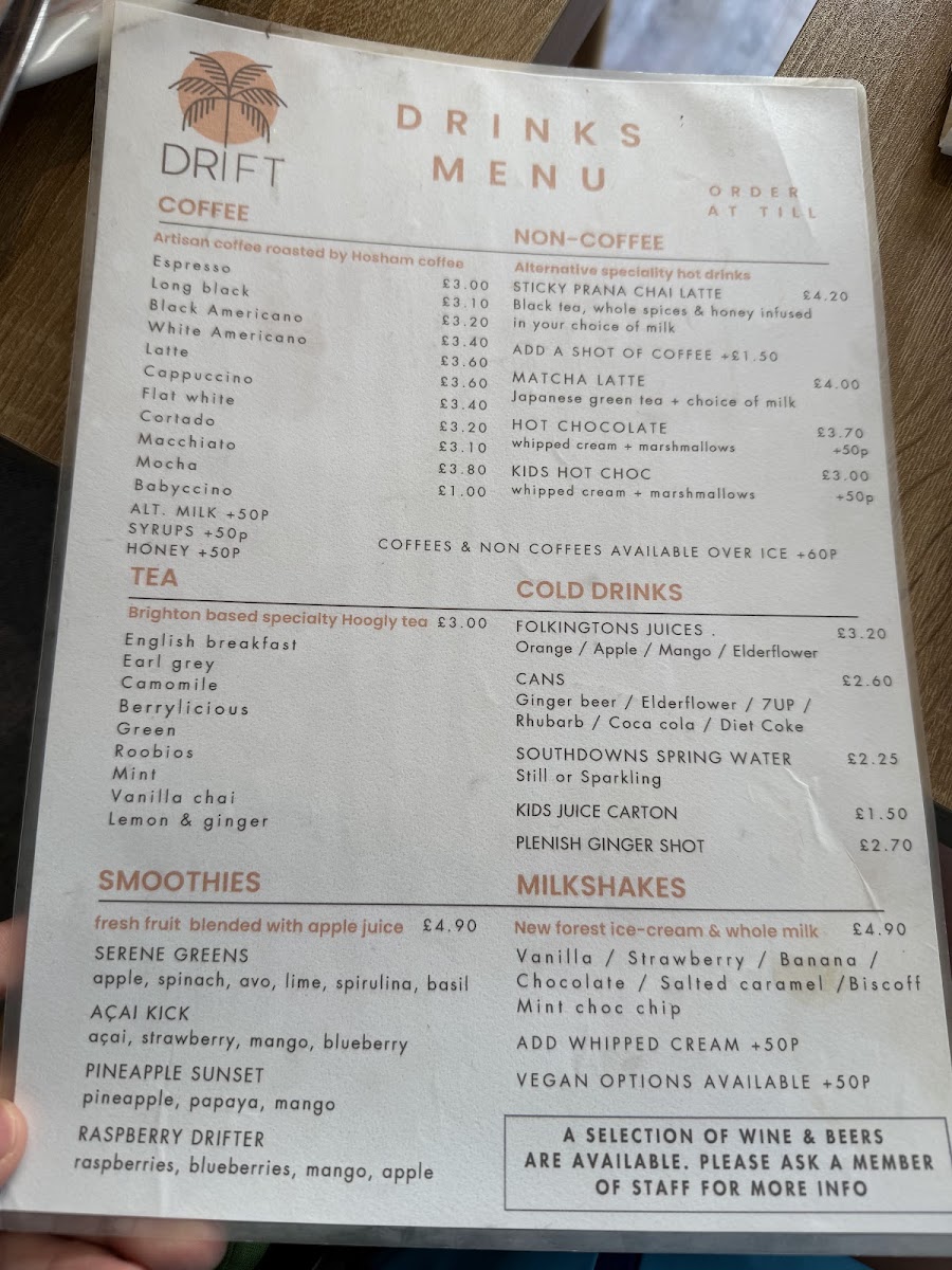 Drift Shoreham offers a simple yet inviting café menu, well-suited for casual bites and comforting drinks throughout the day. Whether you're stopping by for breakfast, a light lunch, or a relaxing coffee break, the menu balances familiar favourites with thoughtful twists that feel both satisfying and approachable.